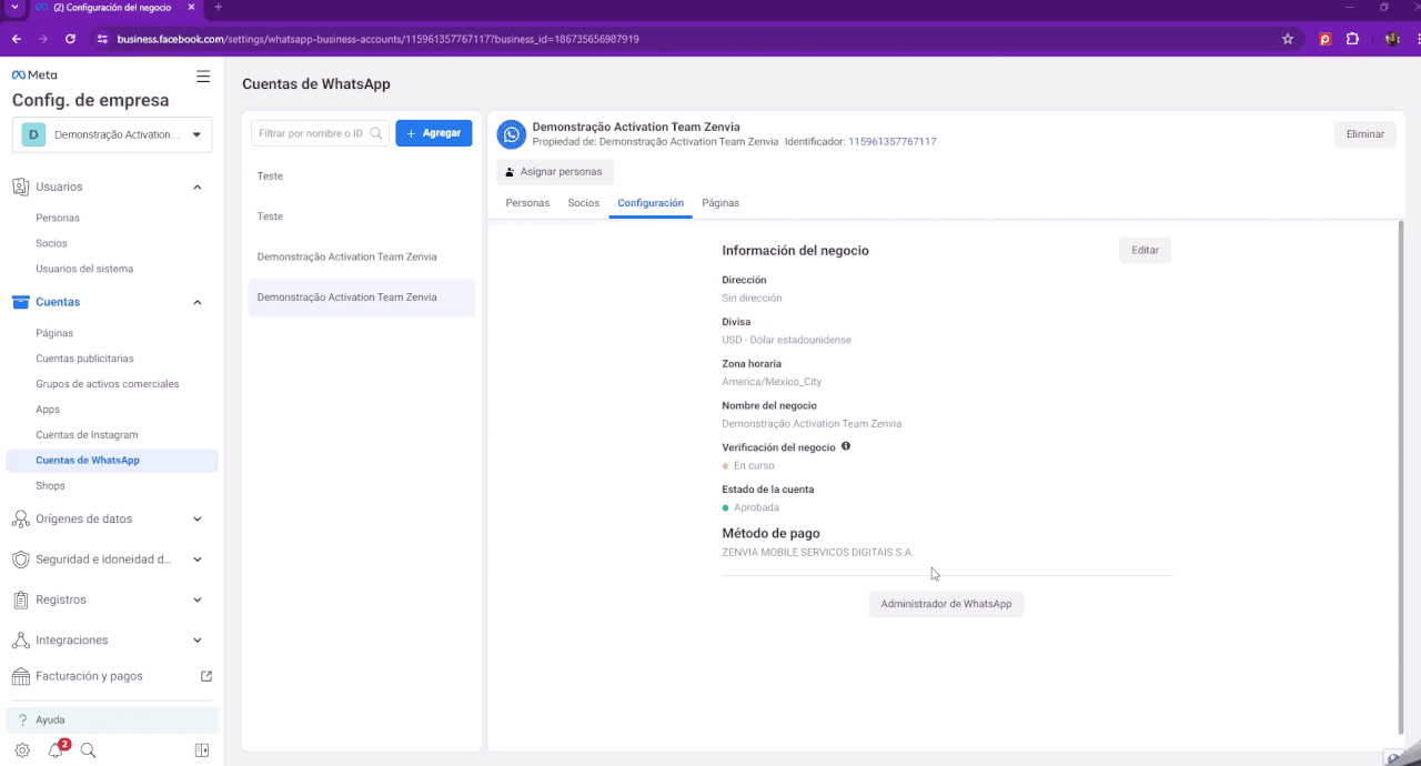 Desde el Administrador comercial de la cuenta (https://business.facebook.com/), haz clic en el nombre de la cuenta (en la esquina superior izquierda) y después haz clic en configuración (ícono de engrenaje). Luego, haz clic en las siguientes opciones: Cuentas de Whatsapp, Configuración y Administrador de Whatsapp.