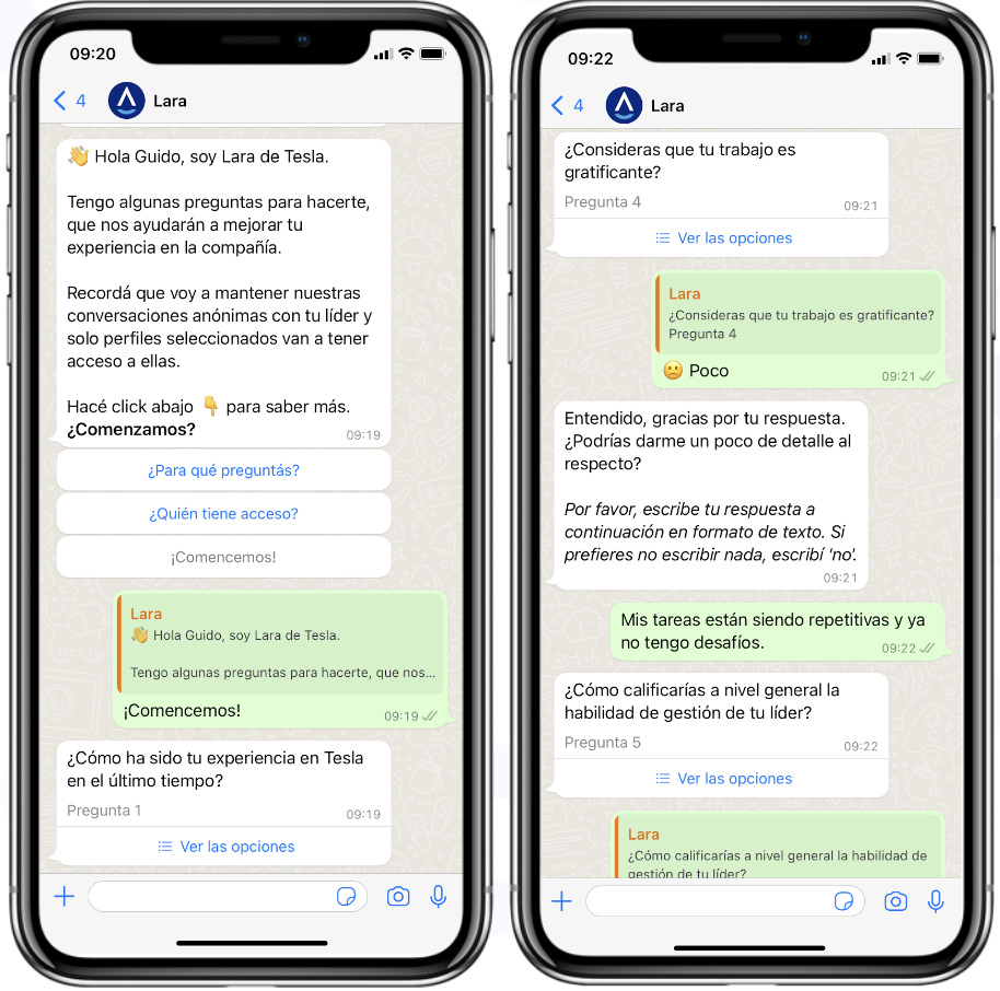 Con una frecuencia aproximada de 30 días, Lara realiza a cada colaborador, una pequeña encuesta de aproximadamente 10 preguntas sobre su experiencia en la compañía, generando métricas sobre la experiencia de los equipos que podrán ser accedidas por el equipo de Recursos Humanos y por los líderes, de manera confidencial.