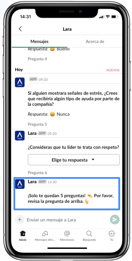 Lara enviará hasta 4 mensajes recordatorios si no obtiene respuesta, dentro de los 12 días hábiles desde el primer mensaje de Lara al colaborador para iniciar el chat. Ejemplo:
