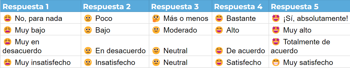 • También hay algunas preguntas con 3 opciones de respuesta, escalas del 1 al 10, o respuestas de texto libre. La gran mayoría de las preguntas son de 5 opciones.