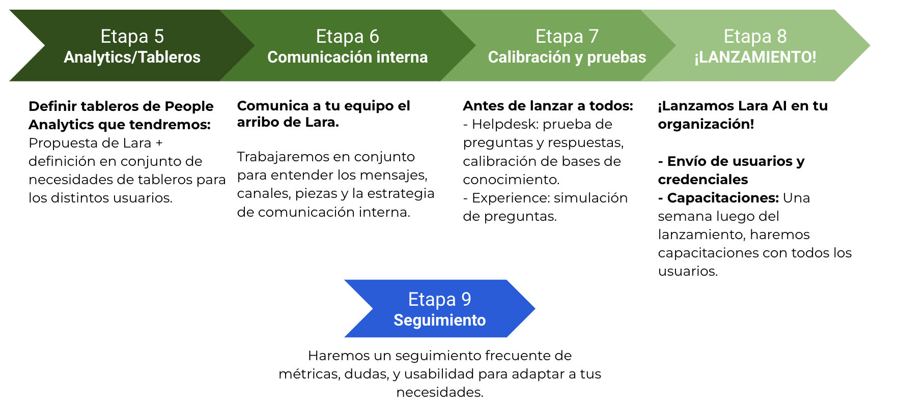 La etapa de kick-off se suele dividir entre 1 y 2 reuniones, donde conocerás al equipo de Customer Experience de Lara AI que te acompañará durante la implementación.