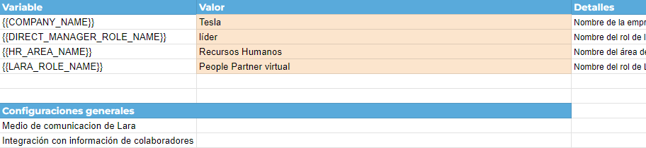 Las variables son palabras que serán usadas en los mensajes de apertura y cierre. Debes reemplazarlas en la pestaña de “Variables” bajo la columna “Valor”.