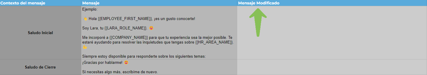 En la pestaña “Variables y mensajes” encontrarás los mensajes con los cuales se comienzan y se cierran los chats, que Lara muestra previa y posteriormente la selección de opciones. En caso de querer modificar un mensaje, escribe el nuevo mensaje en la columna “Mensaje Modificado”.