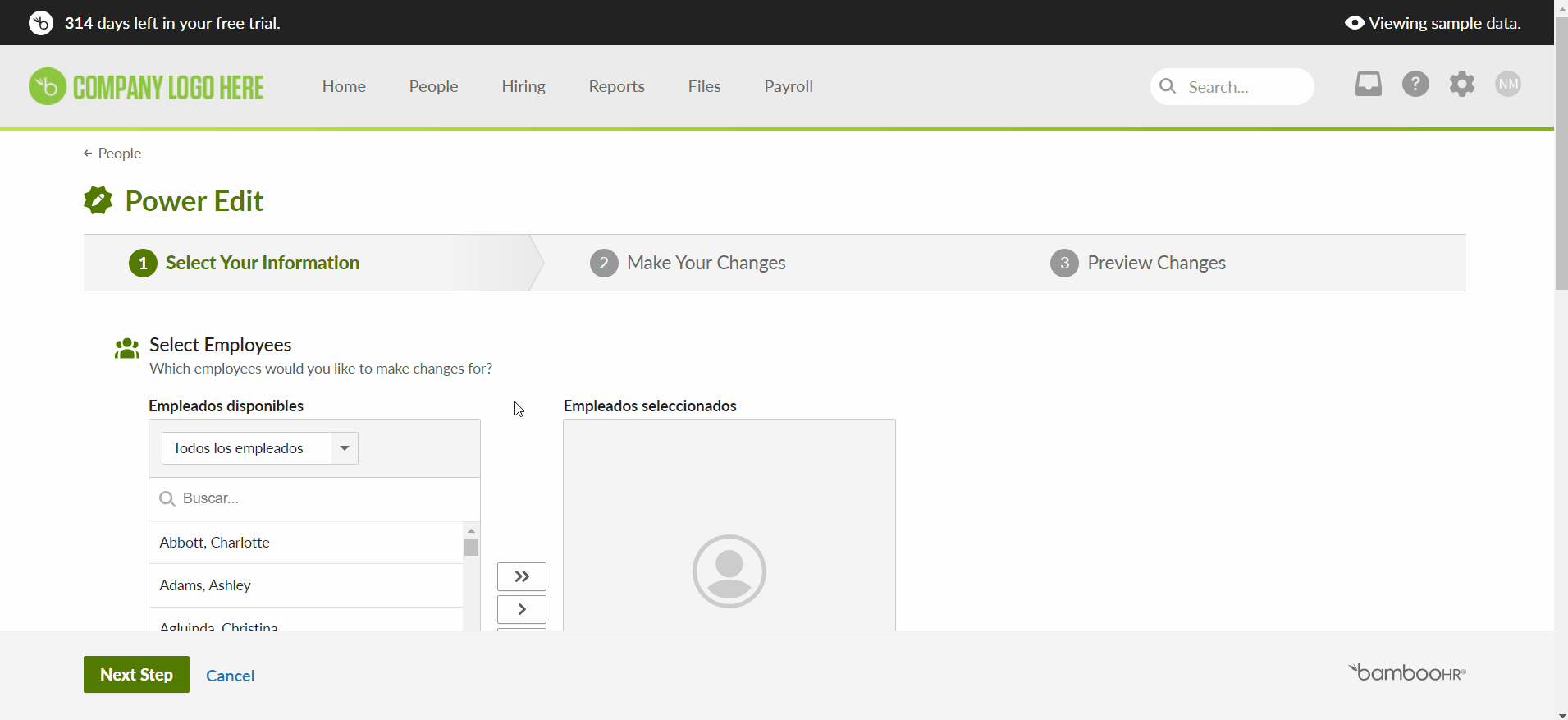 Para esta edición masiva puedes seleccionar los empleados, el campo que se quiere editar, seleccionar la opción correspondiente y aplicar el cambio para todos.