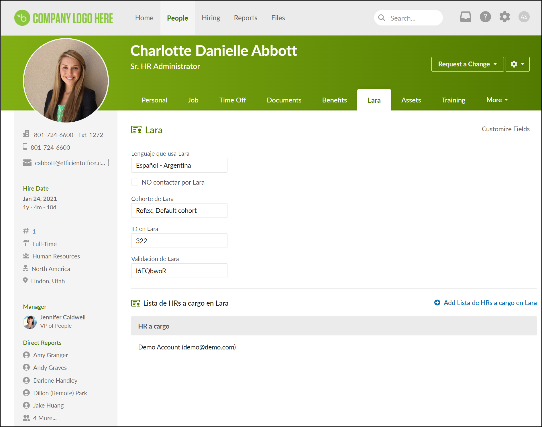 Paso 3: Cuando el equipo de Soporte de BambooHR haya agregado los campos custom necesarios (generalmente tardan entre 24 y 48hs luego del envío del correo del Paso 1), en el perfil de cada colaborador va a aparecer una nueva pestaña llamada “Lara” con estos nuevos campos (como se observa en la siguiente imagen):