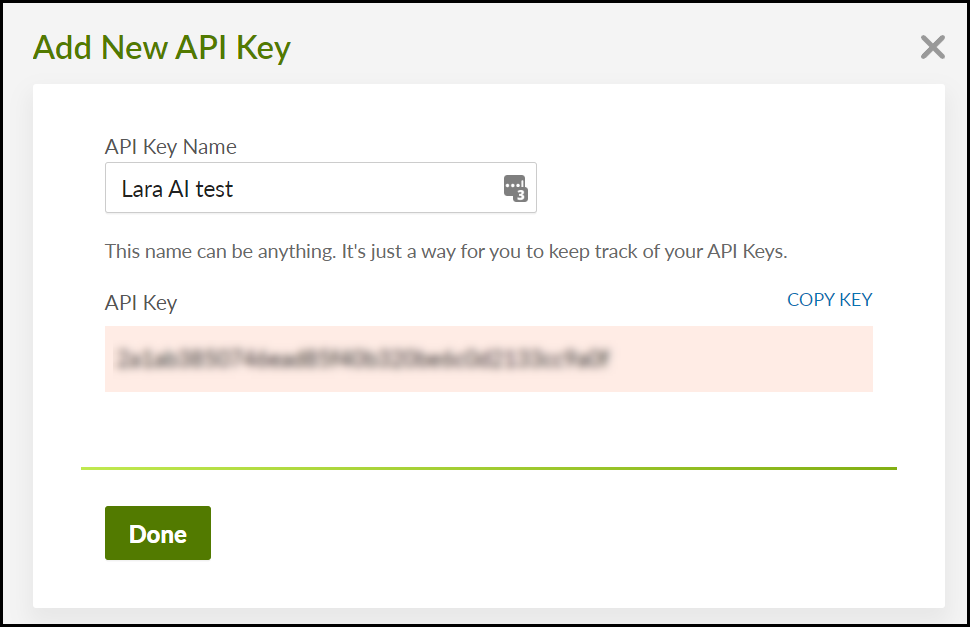 Y copiar la nueva API Key generada para compartir con el equipo de Implementations de Lara: