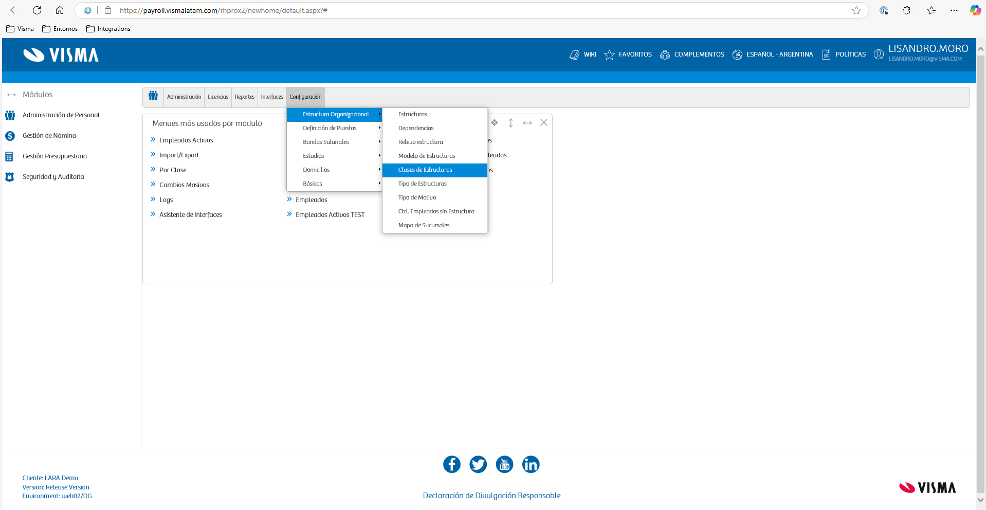 A. Dirígite a: Administración de personal -> Configuración -> Estructura Organizacional -> Clases de Estructuras. Debes hacer click en "Alta" para crear el espacio en el cual estarán los campos de Lara.