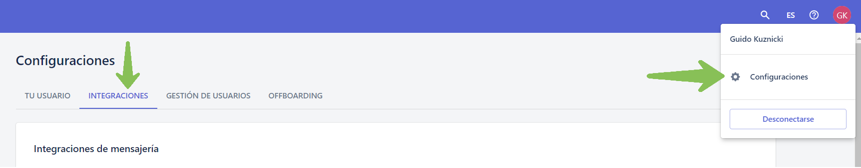 1) Haz click en “Configuraciones”. Accede desde el menú superior derecho. Luego, haz click en “Integraciones”.