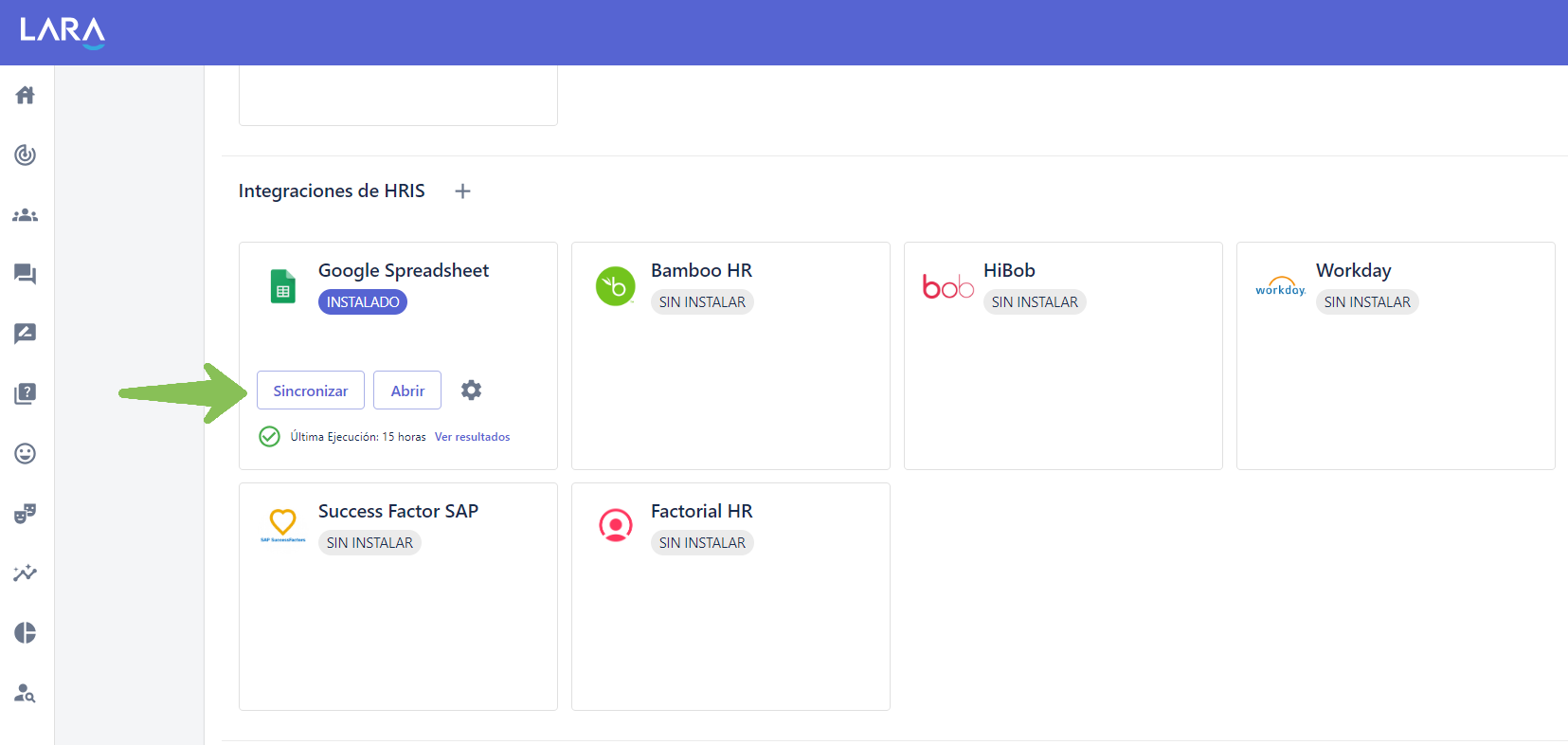 2) Haz click en “Sincronizar” sobre la integración de la base de datos de colaboradores que poseas (para actualizar la información de los colaboradores, debes ir a Integraciones de HRIS, justo debajo de Integraciones de Mensajería).