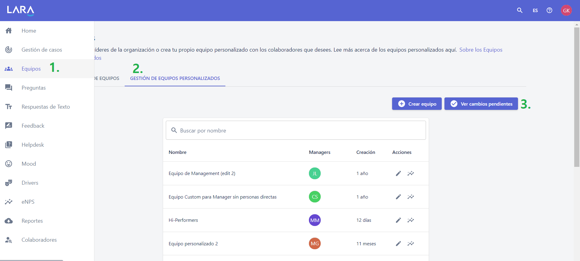 En la siguiente pantalla, podrás ver el listado con todos los cambios solicitados por los líderes (sobre los distintos equipos personalizados) que todavía están pendientes de aprobación.
