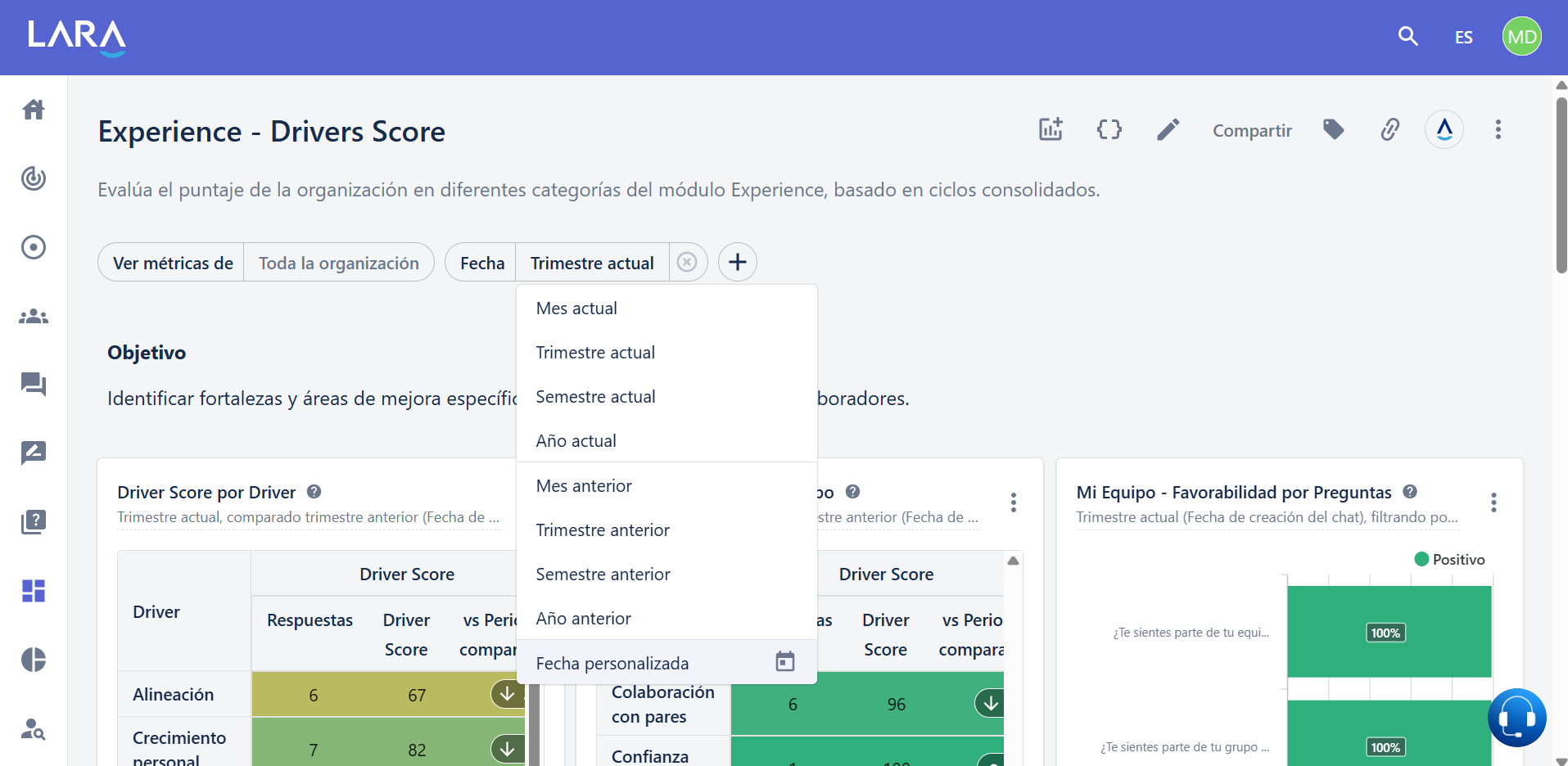 Dentro de las diferentes opciones de filtros que puedes encontrar en los tableros, tendrás la opción de filtrar por Fecha. Con la misma podrás seleccionar distintas ventanas de tiempo el inicio y el fin del periodo que quieras consultar.