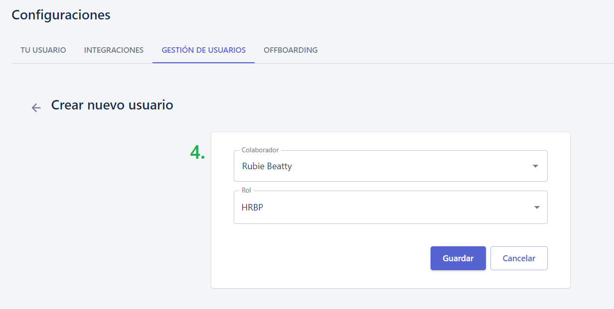4) Selecciona el colaborador al que quieras crearle el usuario y luego selecciona el “Rol”, del cual dependerán los permisos que quieras darle al colaborador en la plataforma. Para más información sobre roles, ingresa aquí.