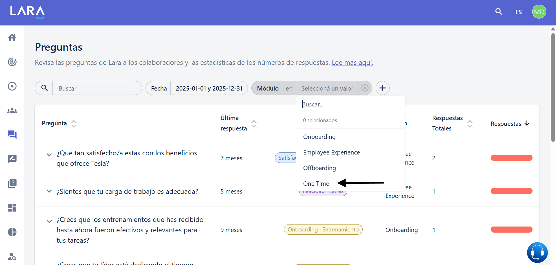 Para consultar las respuestas de estas preguntas One Time puedes hacerlo desde la sección Preguntas filtrando por el módulo One Time: