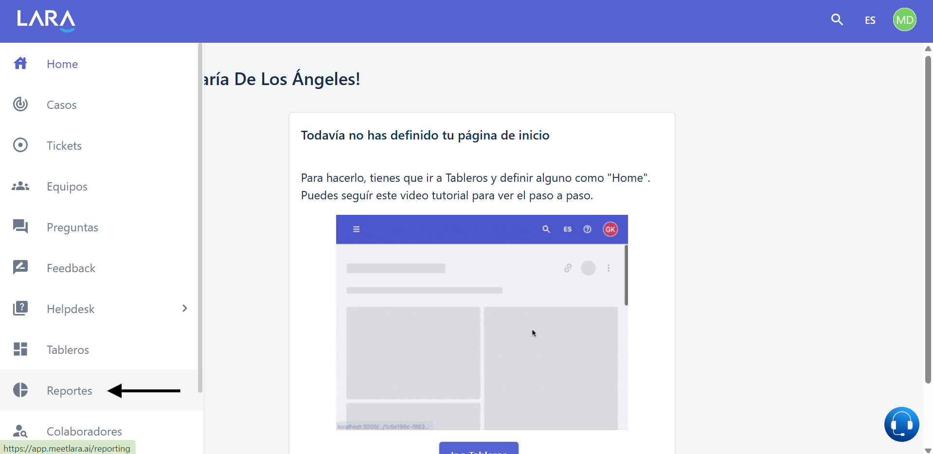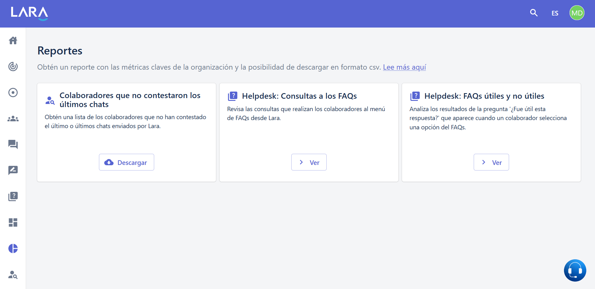 Si quieres tener acceso a los reportes sobre diferentes métricas y datos obtenidos a través de las respuestas que obtiene Lara a partir de los chats con los colaboradores, puedes ingresar desde la plataforma en la pantalla Reportes, y desde allí descargarlos.