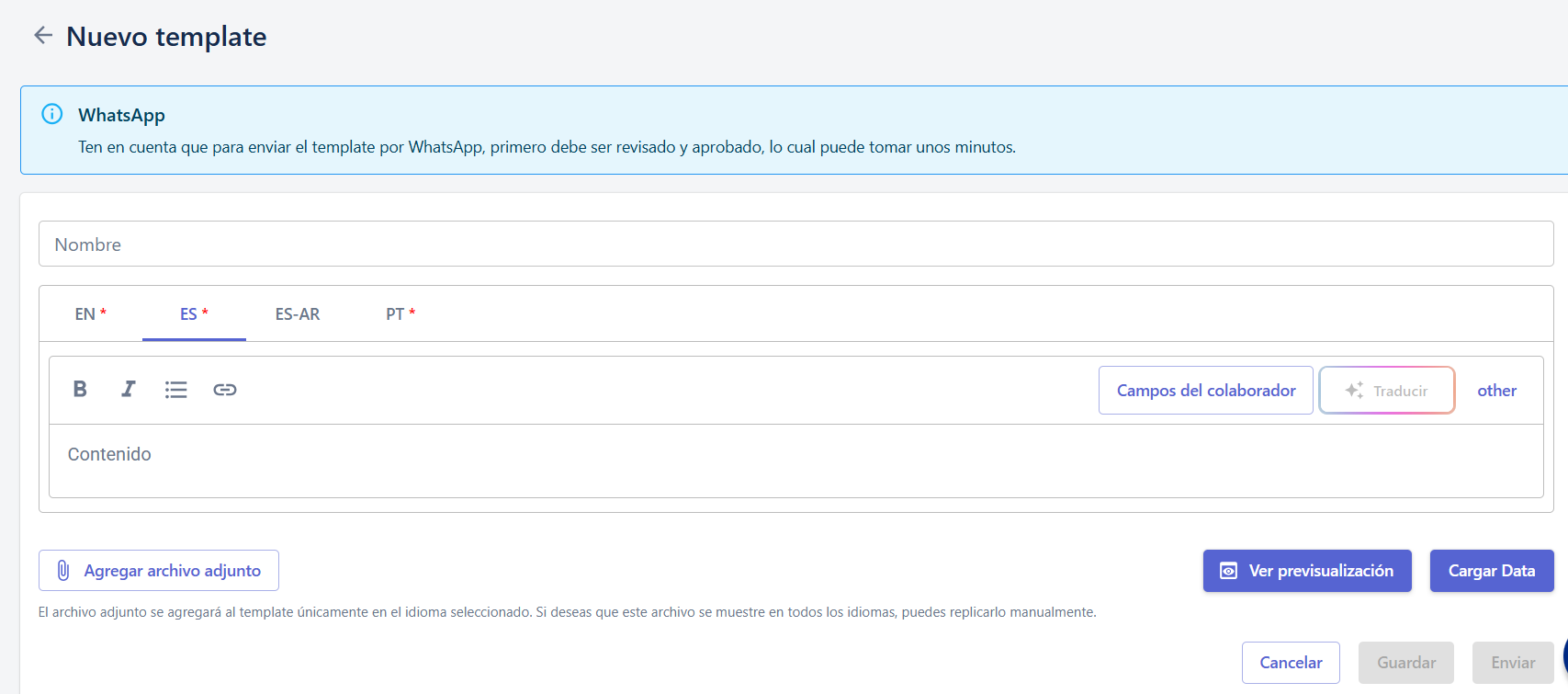 5. Traducción: Asegúrate de traducir el contenido a todos los idiomas configurados en tu organización.