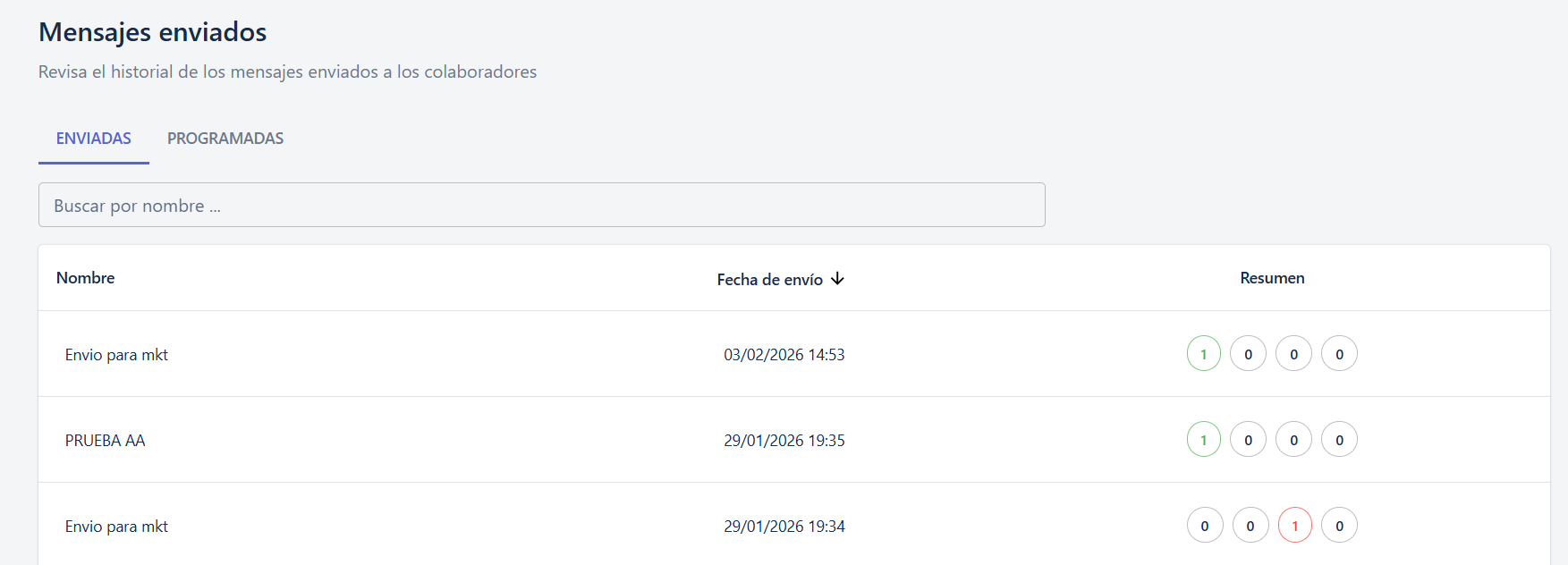 • Monitoreo: Verás el nombre de la comunicación, la fecha y el estado actual (Enviado, Pendiente, Error u Omitido).